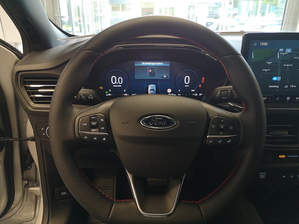 - Lenkrad, ST-Line-Design, unten abgeflacht und mit roten Ziernähten, Sensico in Leder-Optik